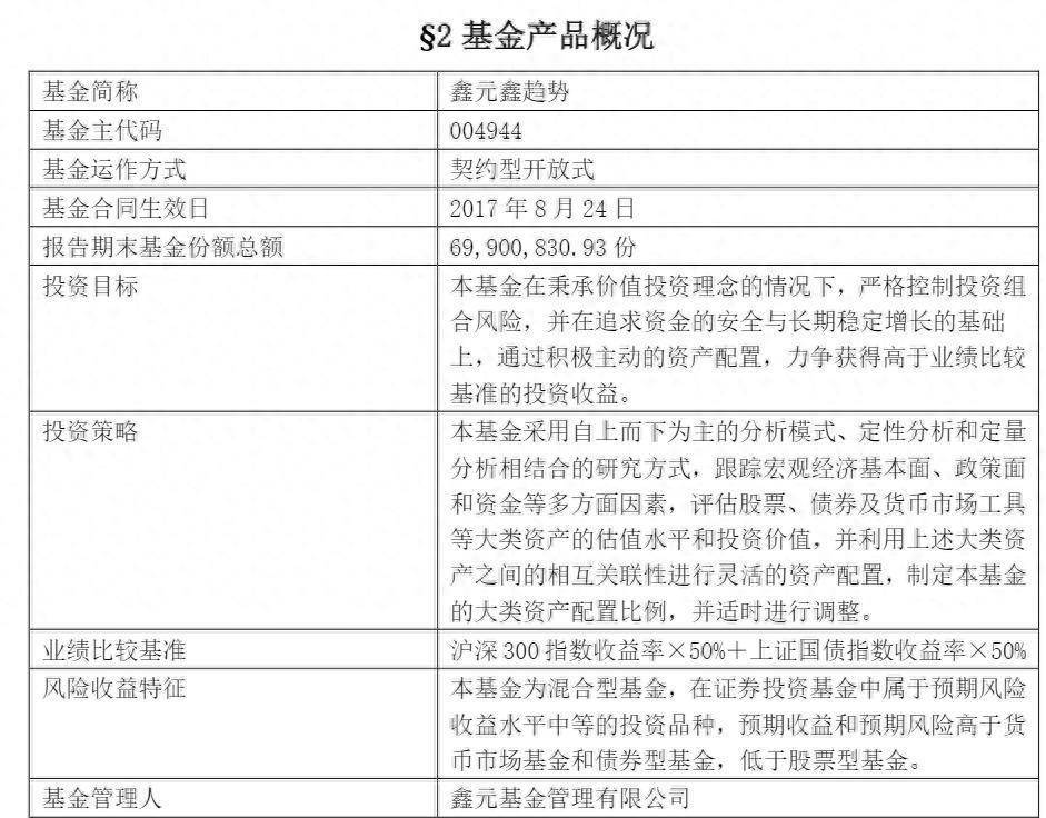 长期超额收益显著:成立以来跑赢业绩基准超过60个百分点公开资料显示,鑫元鑫趋势的业绩比较基准为:沪深300指数收益率×50%+上证国债指数收益率×50%。基金的投资目标为:在秉承价值投资理念的情况下,严格控制投资组合风险,并在追求资金的安全与长期稳定增长的基础上,通过积极主动的资产配置,力争获得高于业绩比较基准的投资收益。