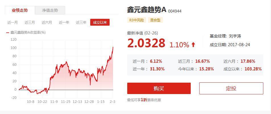 Wind数据显示,截至2026年2月26日,鑫元鑫趋势A成立8年多净值累计上涨103.28%,跑赢业绩比较基准超过60个百分点;过去1年净值上涨31.3%,跑赢业绩基准超过20个百分点。