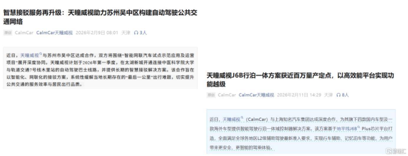 一方面,2月11日,天瞳威视通过其公众号披露斩获某上海知名车企近百万台量产定点——业内普遍推测合作方为其重要产业投资方上汽集团,这为其L2-L2+级量产业务注入规模性增量;另一方面,几乎同一时间段,中标苏州市吴中区长期智慧交通项目,L4级自动驾驶巴士于今年一季度在太湖新城开通接驳线路,标志着其高阶技术在城市微循环场景的渗透。