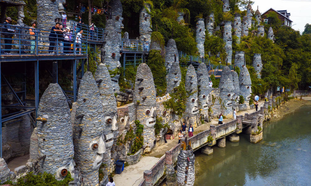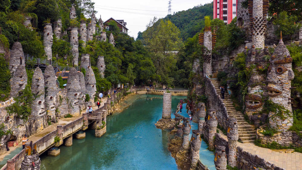 贵州省贵阳市花溪区花溪夜郎谷景区有一座耗时多年打造的“石头王国”,它将夜郎文化与喀斯特地貌相结合,200余座石砌图腾柱造型奇特,充满原始艺术气息,吸引不少游客打卡游览。