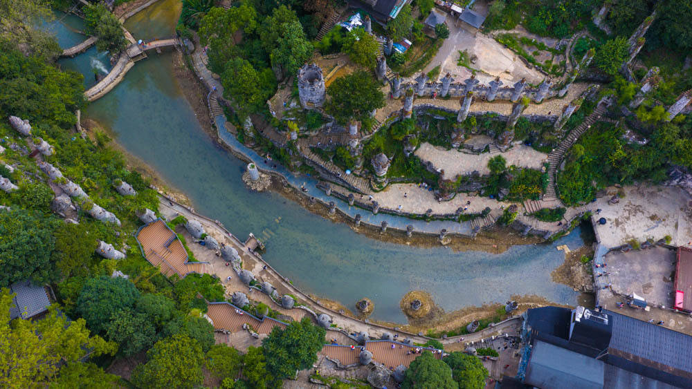 ↑2025年9月9日,游客在贵州省贵阳市花溪区花溪夜郎谷景区参观游览。(无人机照片)CICPHOTO/国伏 摄