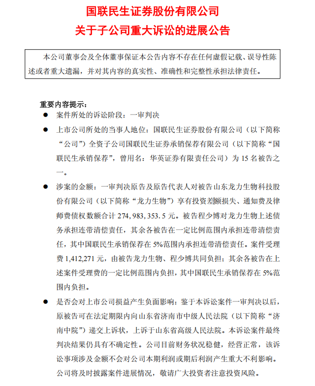 近日,国联民生证券股份有限公司(以下简称“国联民生”)发布关于子公司重大诉讼的进展公告,披露了龙力生物证券虚假陈述责任纠纷一审判决结果。