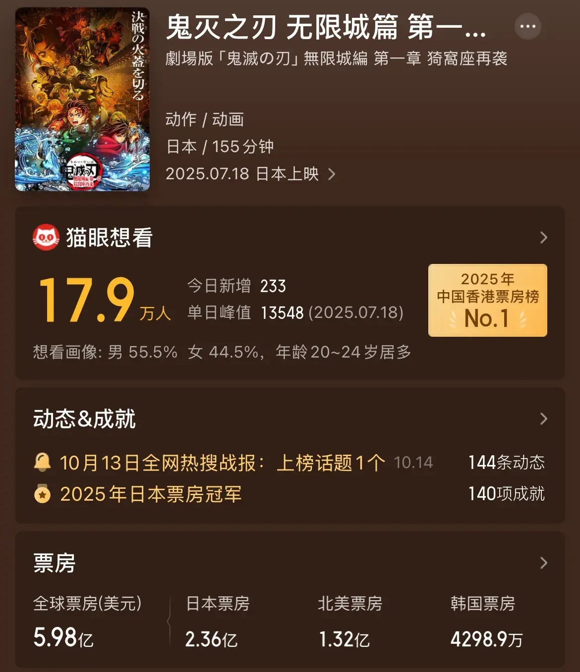 那时候好多人都觉得,《千与千寻》这座大山,怕是后无来者了。谁能想到,二十年后的今天,居然杀出一部《鬼灭之刃 无限城篇 第一章》,直接把全球观众看得目瞪口呆,也让日本动画的票房神话再度升级!