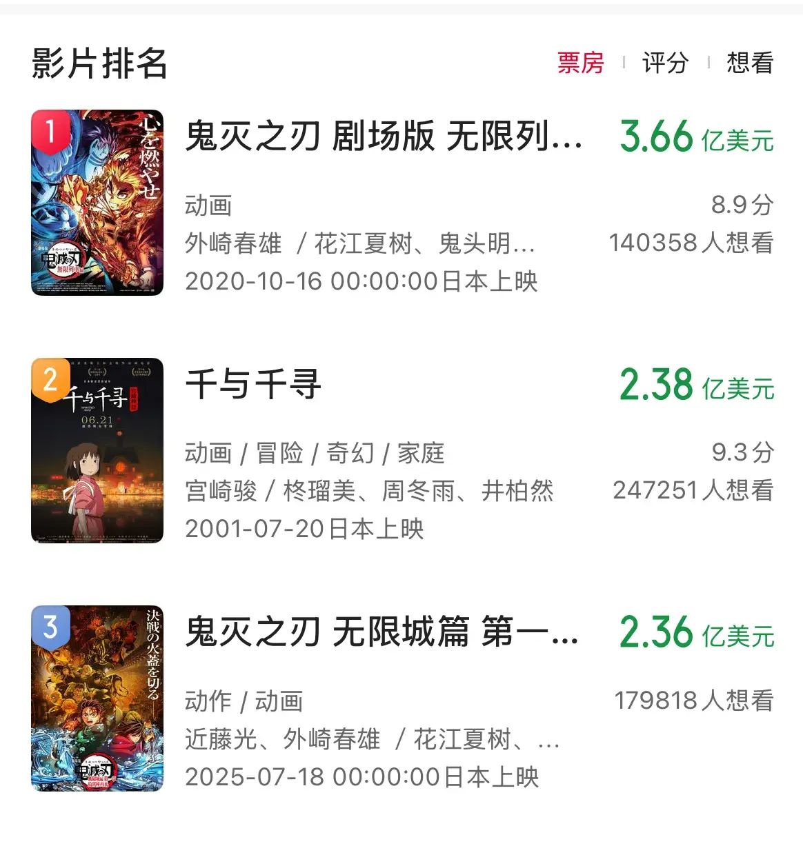 其实早在2020年,《鬼灭之刃 剧场版 无限列车篇》就已经悄悄把《千与千寻》的王冠给掀了。