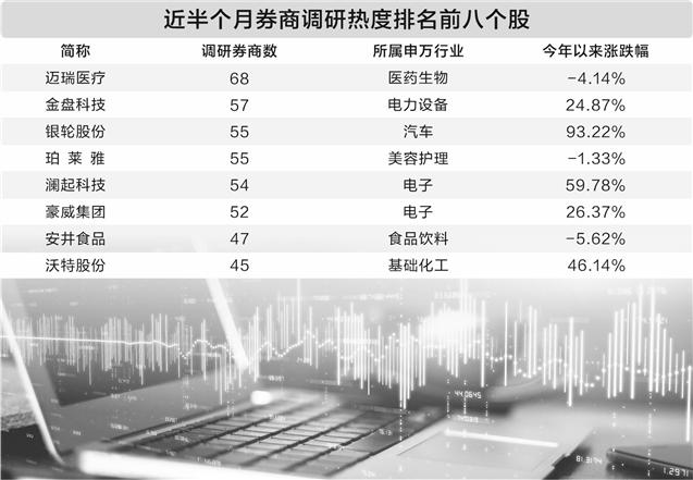 在券商扎堆调研的热门股中,迈瑞医疗吸引了平安证券、瑞银证券等68家券商的调研,人气最高,机构投资者主要关注该公司业绩如何走出困境、国际业务表现等。同为医药生物板块的新里程、爱博医疗也在近期接受超40家券商调研。
